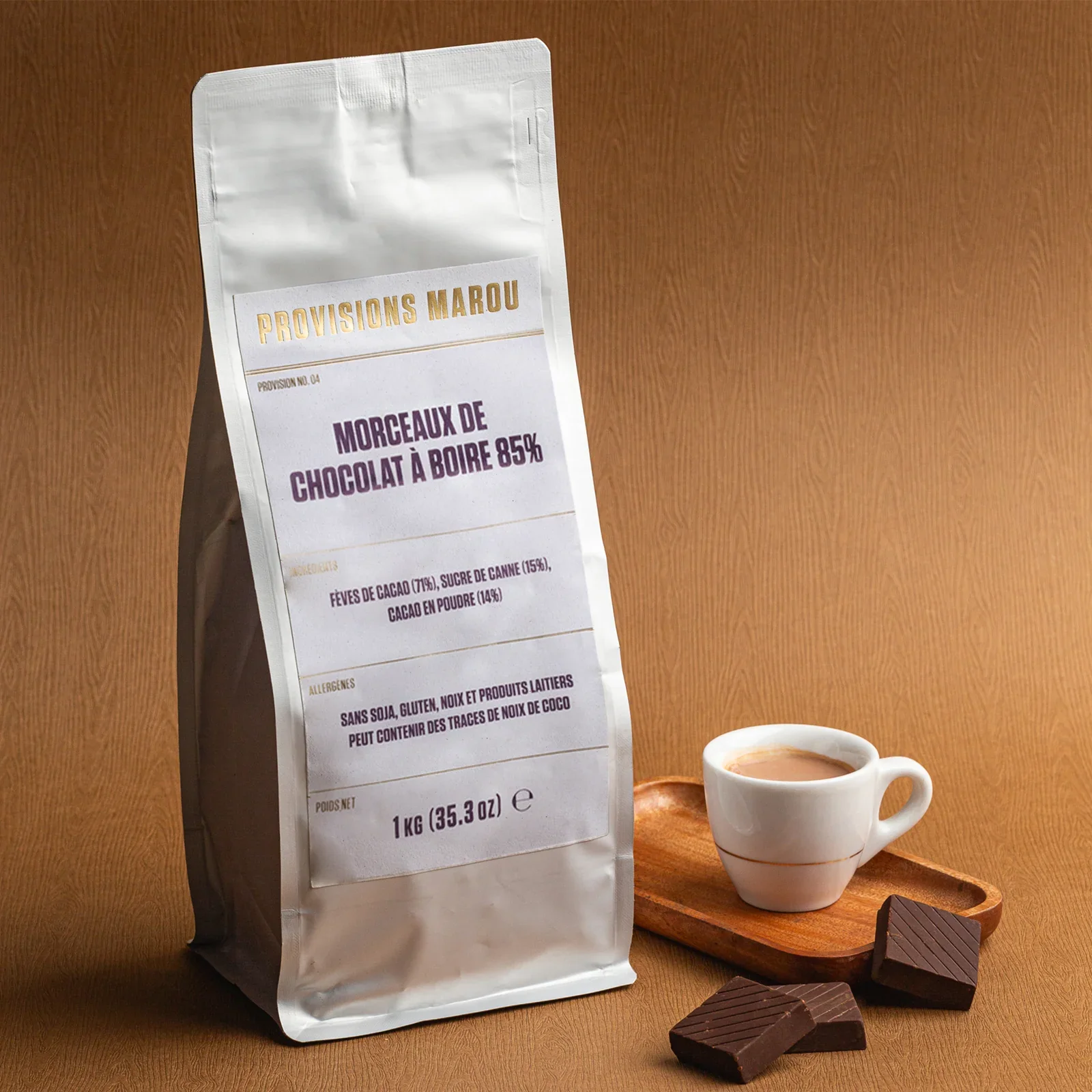 A decadent treat for those who appreciate intense cocoa flavor. This 85% drinking chocolate offers a rich and robust taste, echoing the distinctive nuances of Marou's craftsmanship, for a warm, velvety sip. A 1 kg format for gourmets or professionals.